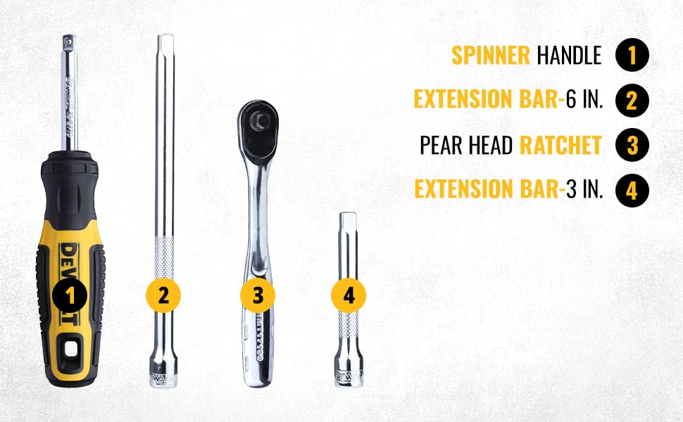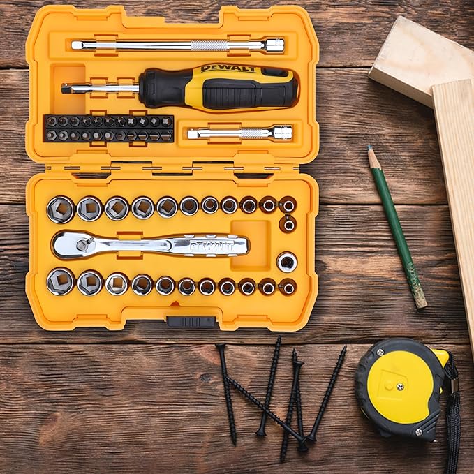 DEWALT DWMT81610-0 1/4″ 50-Piece Drive Mechanics Tool Set with Anti-Corrosion Properties & Knurled Grip Control for Home, DIY & Professional Use, YELLOW & BLACK