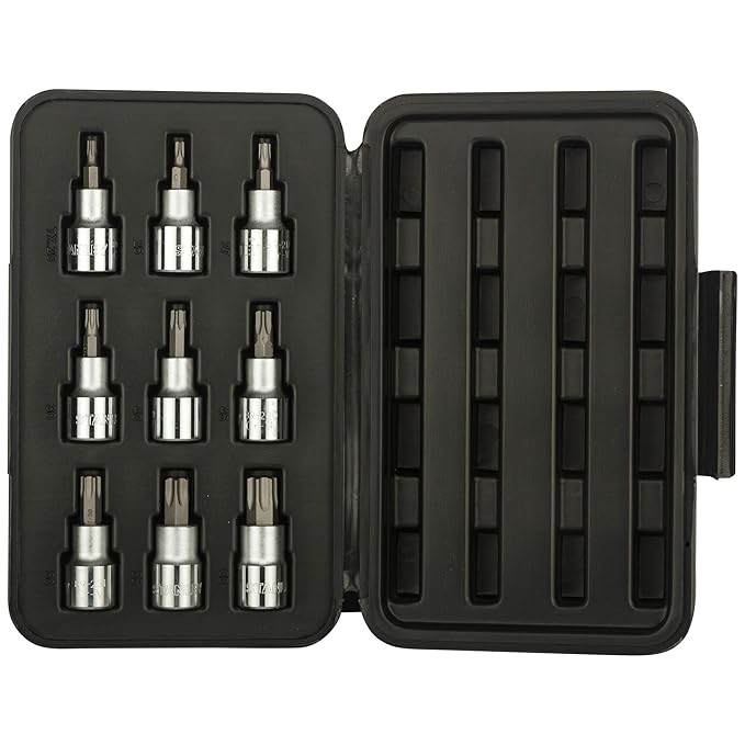 | Included Sizes: The set includes 9 Torx bits: T20, T25, T27, T30, T40, T45, T50, T55, and T60. |
