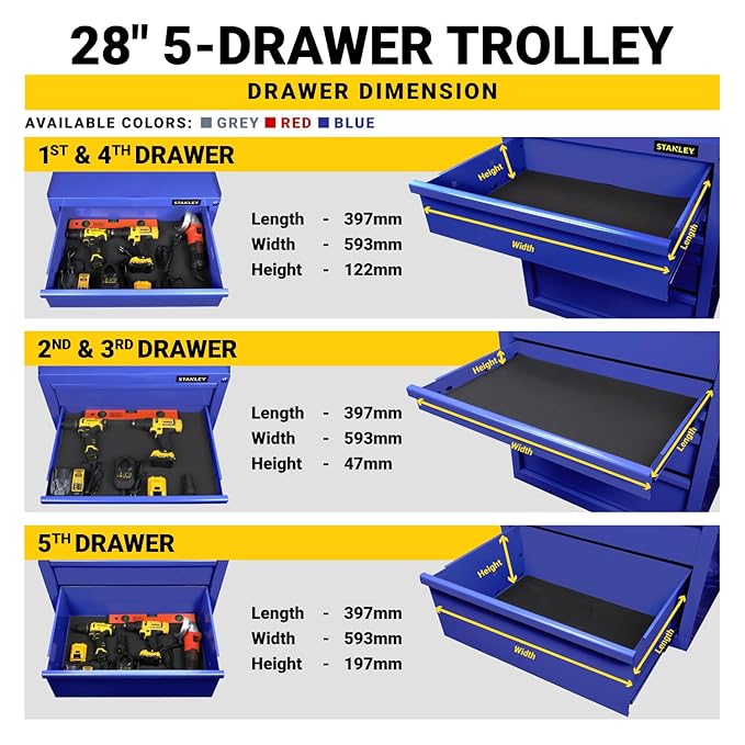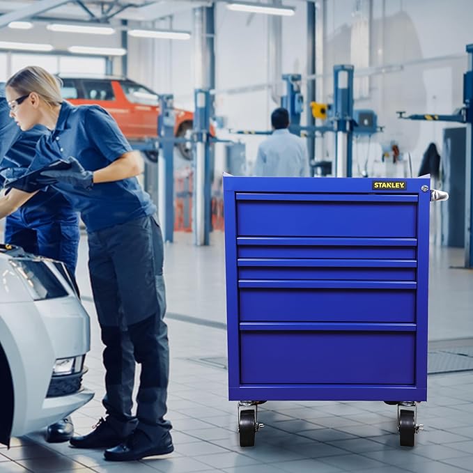 STANLEY STST74421-8 5 Drawer Eco Roller Cabinet Blue, Multi Size Drawers, Lockable, Perforated Side Panels, Roller Castor Wheels for Mobility